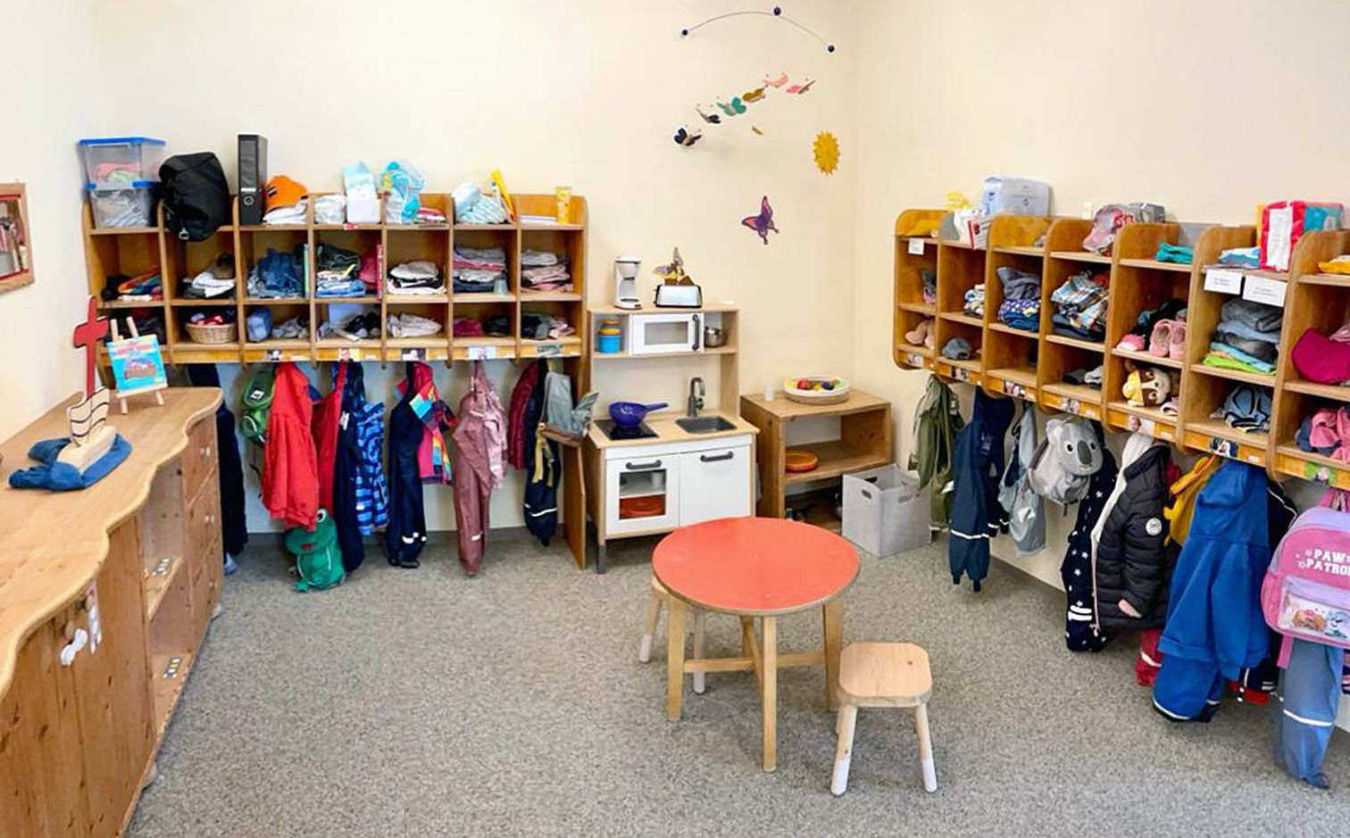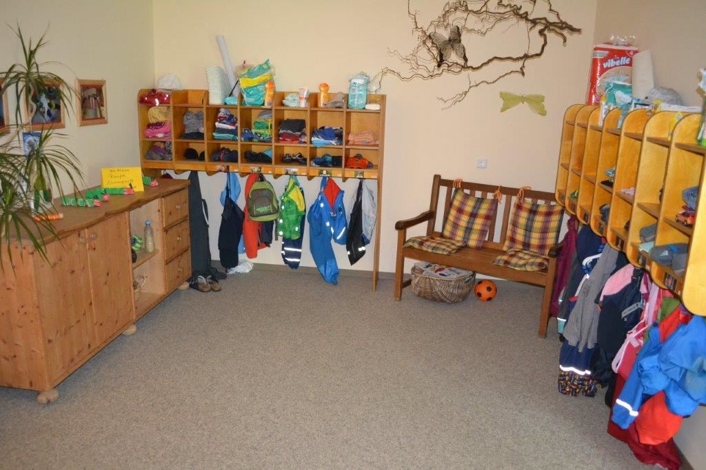 Der Flurbereich, den die Kinder jederzeit nutzen können, bietet ihnen Bewegungs- und Entfaltungsmöglichkeiten z.B. für Rollenspiele oder als Rückzugsort. Außerdem gibt es Magnetwände mit aktuellen Informationen für die Eltern und viel Platz für die Kleidung und Utensilien der Kinder.