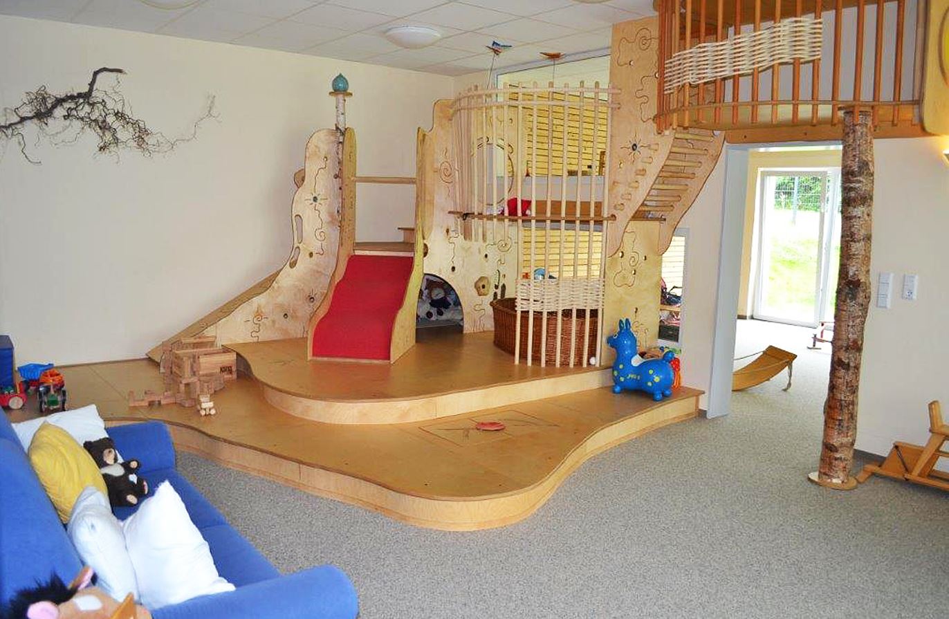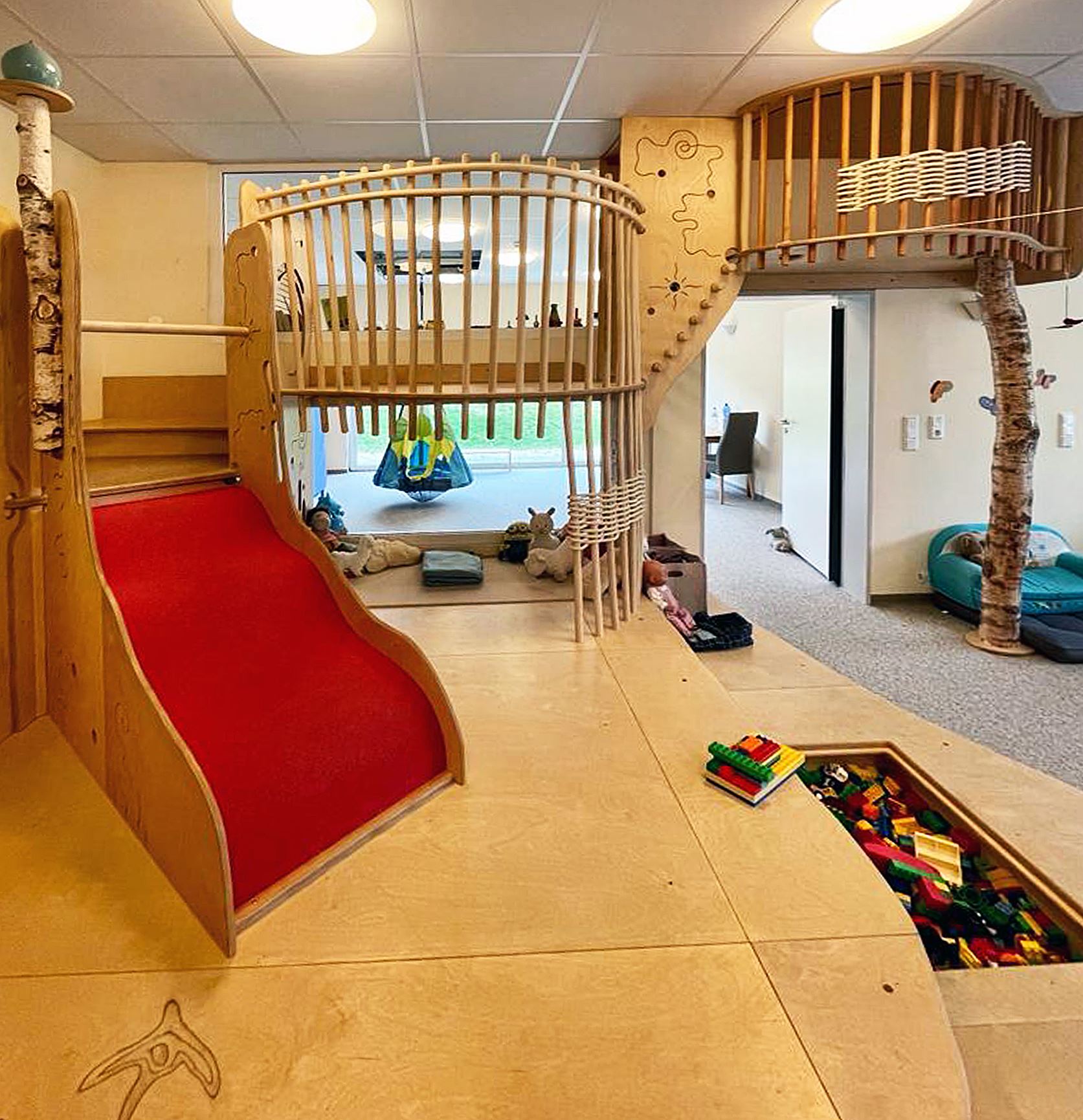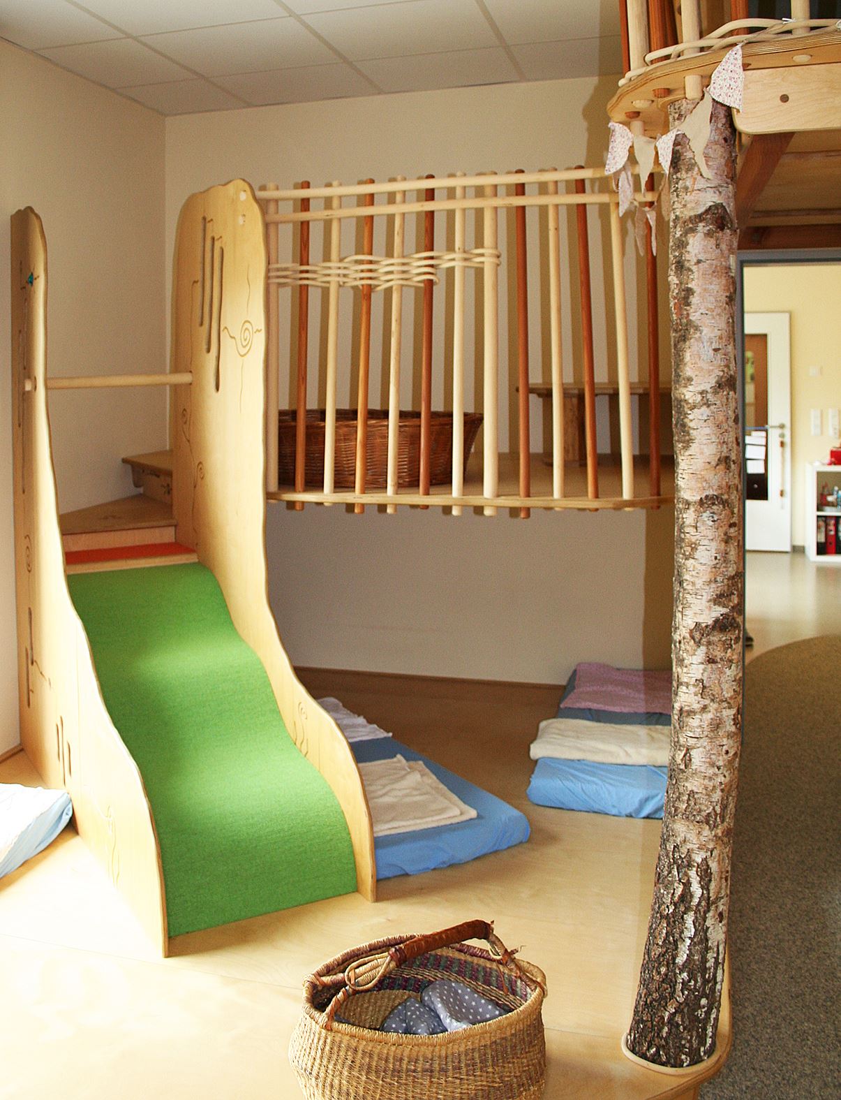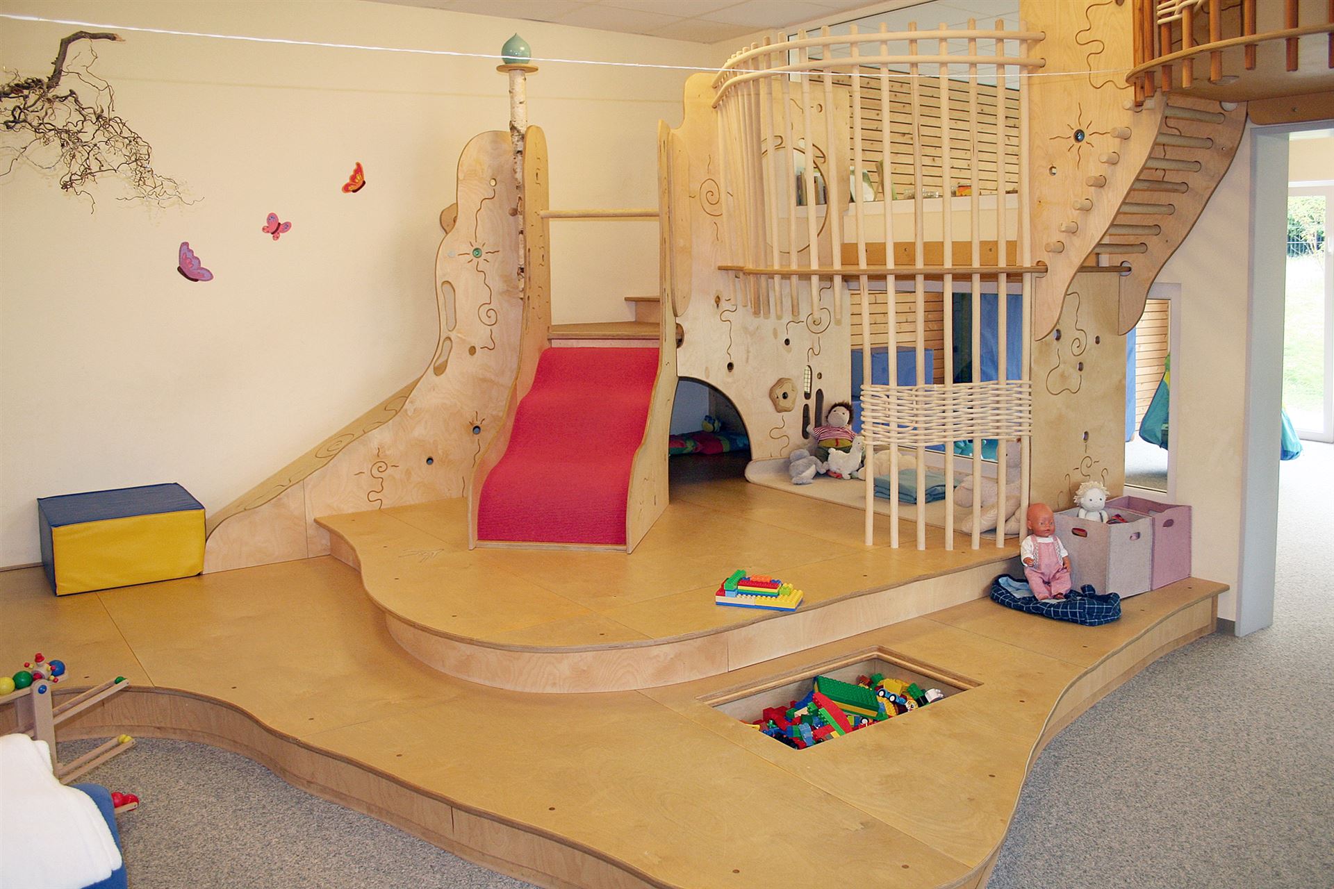 Eine Spiellandschaft kommt den Bedürfnissen der Kinder nach Klettern, Treppen steigen, Rutschen, aber auch Verstecken, Entdecken und Ausruhen nach. Ein reichhaltiges, regelmäßig wechselndes Materialangebot gibt die Möglichkeit, soziales Miteinander zu lernen, Phantasie anzuregen und Sprache weiter zu fördern.