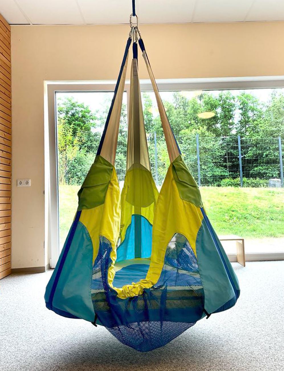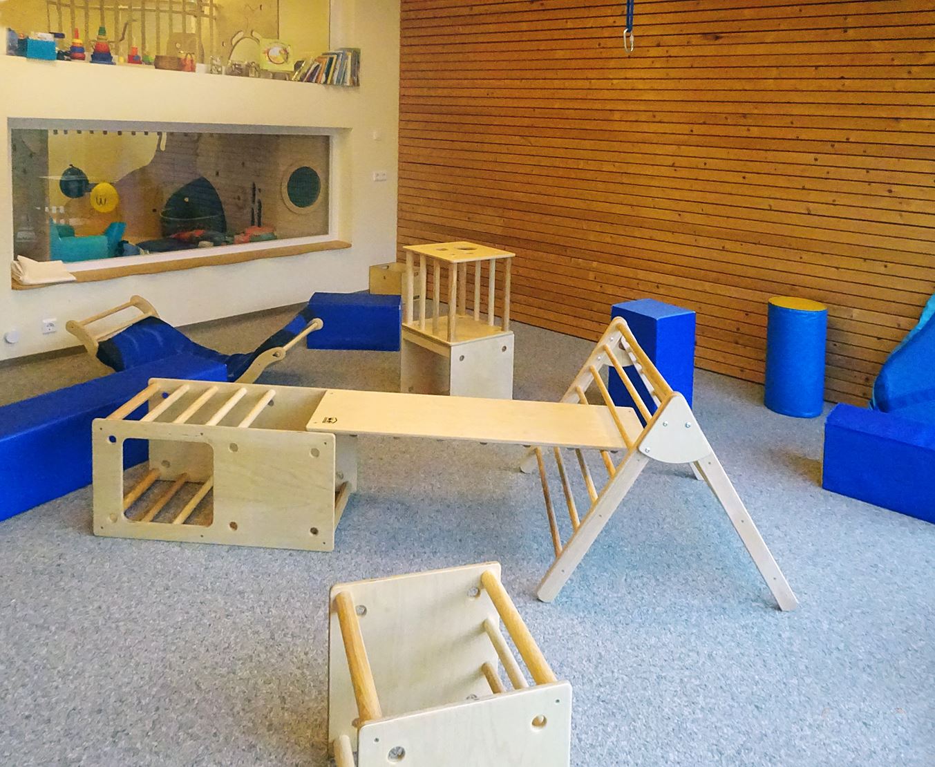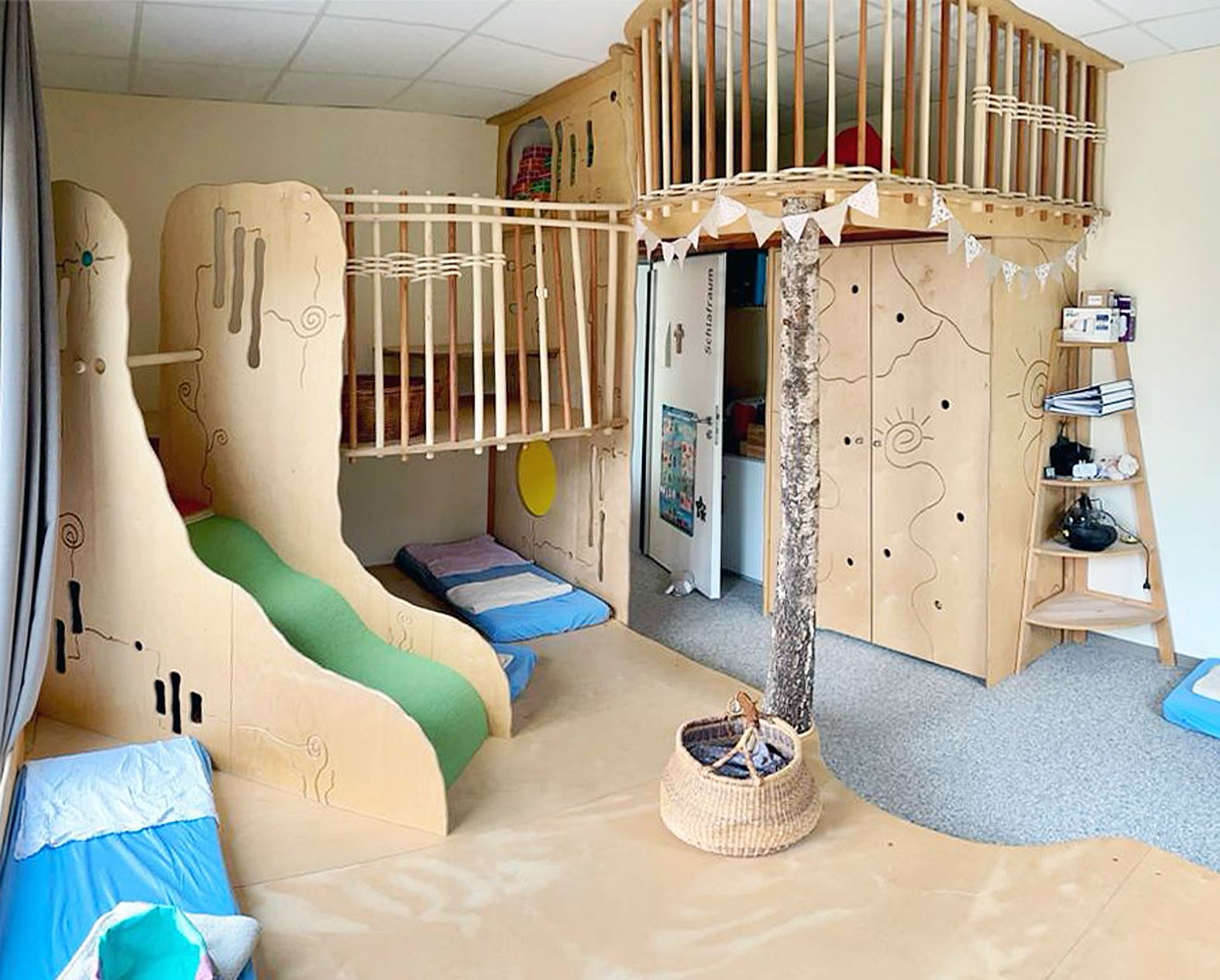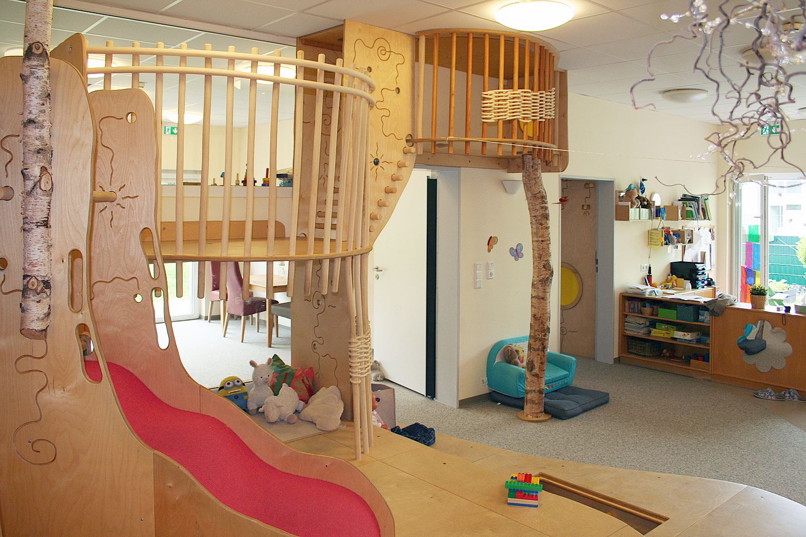 Eine Spiellandschaft kommt den Bedürfnissen der Kinder nach Klettern, Treppen steigen, Rutschen, aber auch Verstecken, Entdecken und Ausruhen nach. Ein reichhaltiges, regelmäßig wechselndes Materialangebot gibt die Möglichkeit, soziales Miteinander zu lernen, Phantasie anzuregen und Sprache weiter zu fördern.