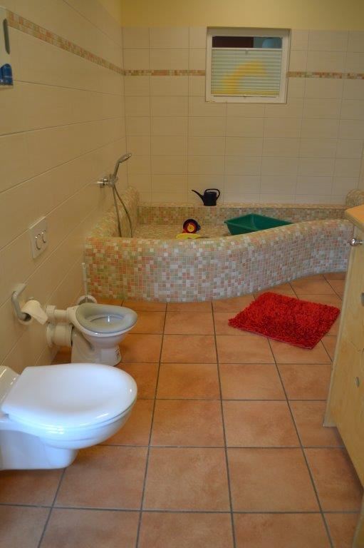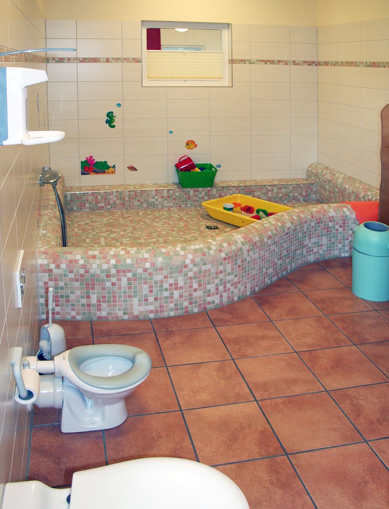 Die Waschrinne mit drei unterschiedlichen Wasserhähnen nutzen die Kinder täglich zur Körperpflege. Sie bietet ihnen aber auch die Möglichkeit, alleine oder zu mehreren mit Wasser zu hantieren und zu experimentieren. Im großen Planschbereich experimentieren die Kinder mit Rasierschaum oder Farben und erleben ihren Körper mit allen Sinnen. Es gibt einen Wickeltisch mit eingebauter Treppe und integriertem Waschbecken, sowie zwei kleine Kindertoiletten.