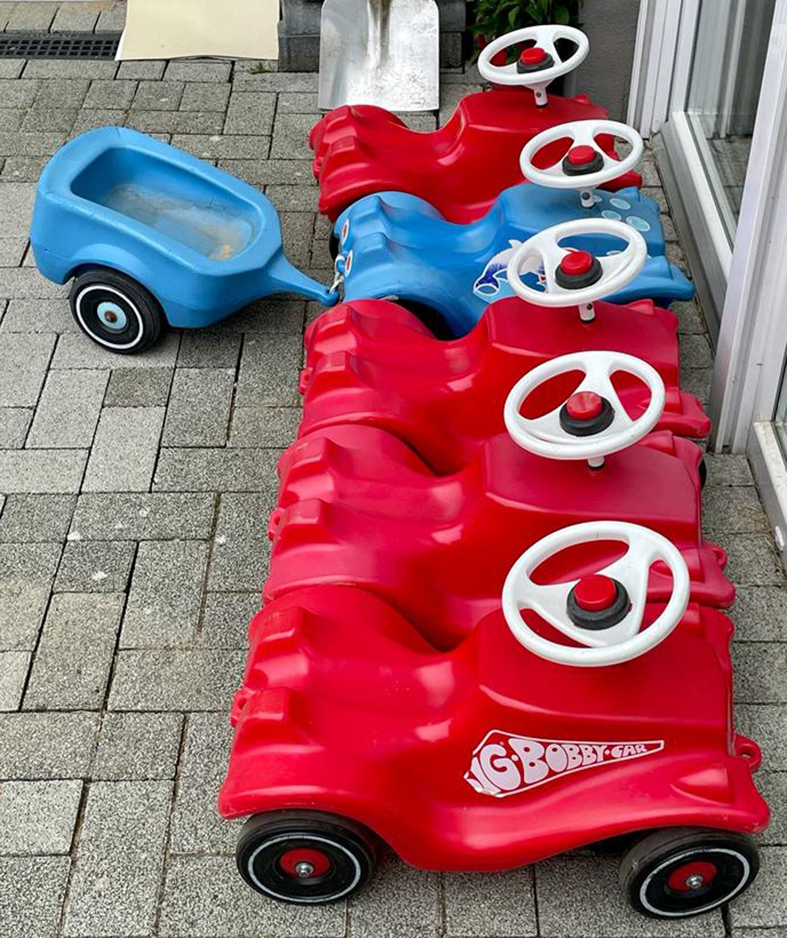 Ein großer Sandkasten, ein Wipptier, ein Hochbeet und die Möglichkeit mit Bobbycars zu fahren lassen keine Langeweile aufkommen.
