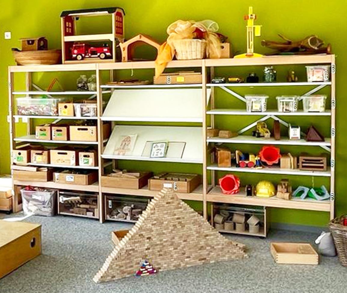 Viel Platz zum Bauen bietet unser Bauzimmer. In den offenen und übersichtlich sortierten Regalen finden die Kinder ganz unterschiedliche Materialien, wie Bausteine, Holzfiguren, Lego und gesammelte Fundstücke aus der Natur wie Steine, Holzscheiben, Äste und Alltagsmaterialien in großer Anzahl. Bilder von Gebäuden und Bücher rund um Baustellen geben ihnen Anreize, etwas nachzubauen.