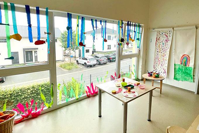 Ob eigene Ideen mit Alltagsmaterialien oder unserer Materialvielfalt in den offenen Regalen, hier werden jeden Tag Kunstwerke erstellt. Hier laden große Malwände und eine Staffelei dazu ein, mit Finger- oder Wasserfarben großflächig zu malen. Für Impulse gibt es einen gesonderten Tisch um den Freiraum für selbständiges Gestalten nicht zu schmälern. Auch in diesem Raum darf eine Couch nicht fehlen, um einfach zu schauen, sich inspirieren zu lassen oder den eigenen Potrtfolio-Ordner anzusehen.