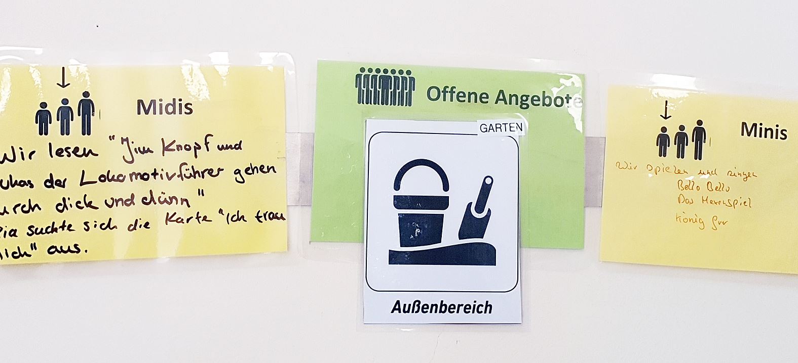 Die große Couch lädt zum Verweilen ein und ist immer wieder Begegnungsstätte. Auch finden Kinder alle Informationen zum Tag visualisiert: Welche Erzieherin bietet in welchem Bereich etwas an? Welche Kleingruppen finden heute statt? Welche Kinder sind schon da, welche fehlen? Wer feiert mit wem Geburtstag? Die Briefkästen für die Themenvorschläge der Kinder, die sie in den Kinderkonferenzen besprechen möchten und die Beschwerdewand haben hier ihren Ort. Für Eltern gibt es zusätzlich in Schriftform viele Informationen, um transparent zu machen, was in Kleingruppen inhaltlich gelaufen ist.