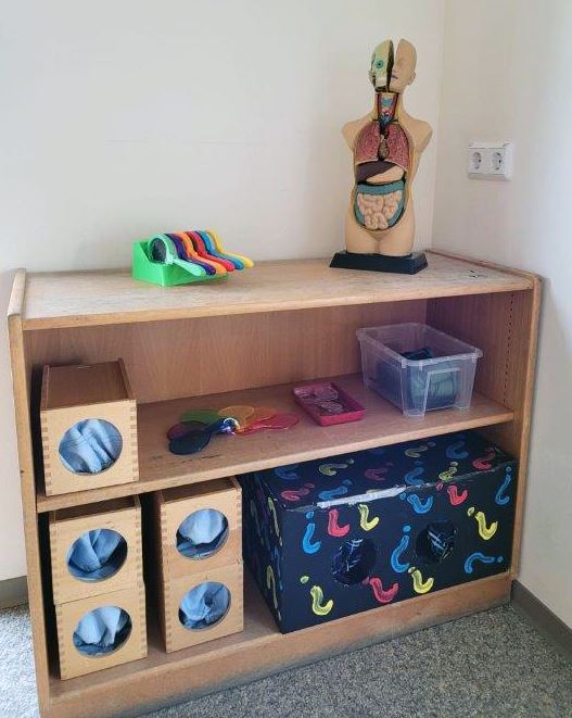 Hier finden sich die verschiedensten Materialien zum Forschen, wie zum Beispiel Magnete, Sanduhren, Modelle vom Körper, Mikroskope, Lichtboarde, Lichtprojektoren und noch vieles mehr. Hier kann jedes Kind etwas finden, das seine Neugier und Entdeckerlust fördert. Manches steht immer zur Verfügung, anderes wird je nach Themen und Interessen der Kinder bereitgestellt und von einer Mitarbeiterin begleitet.
