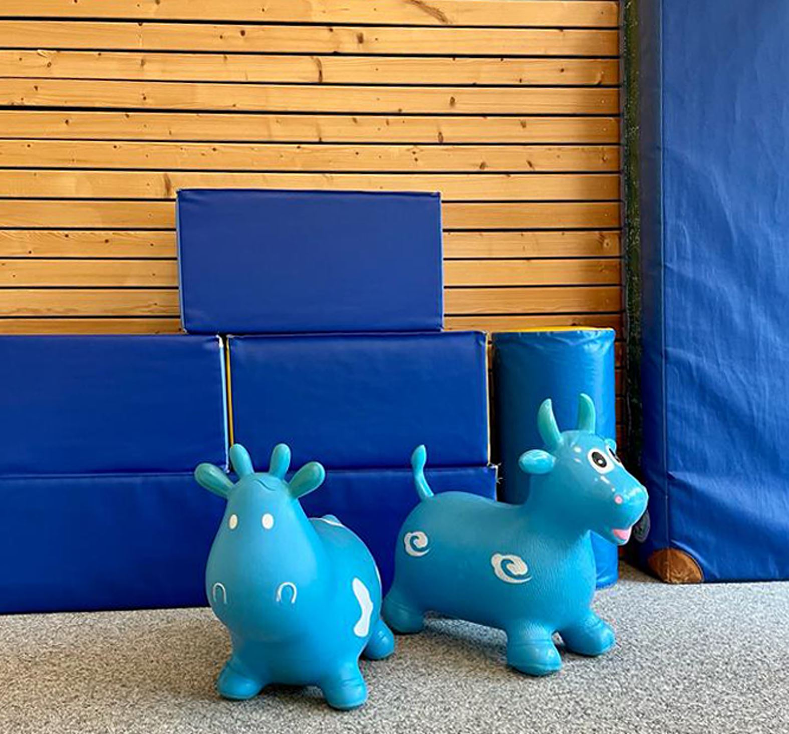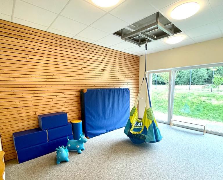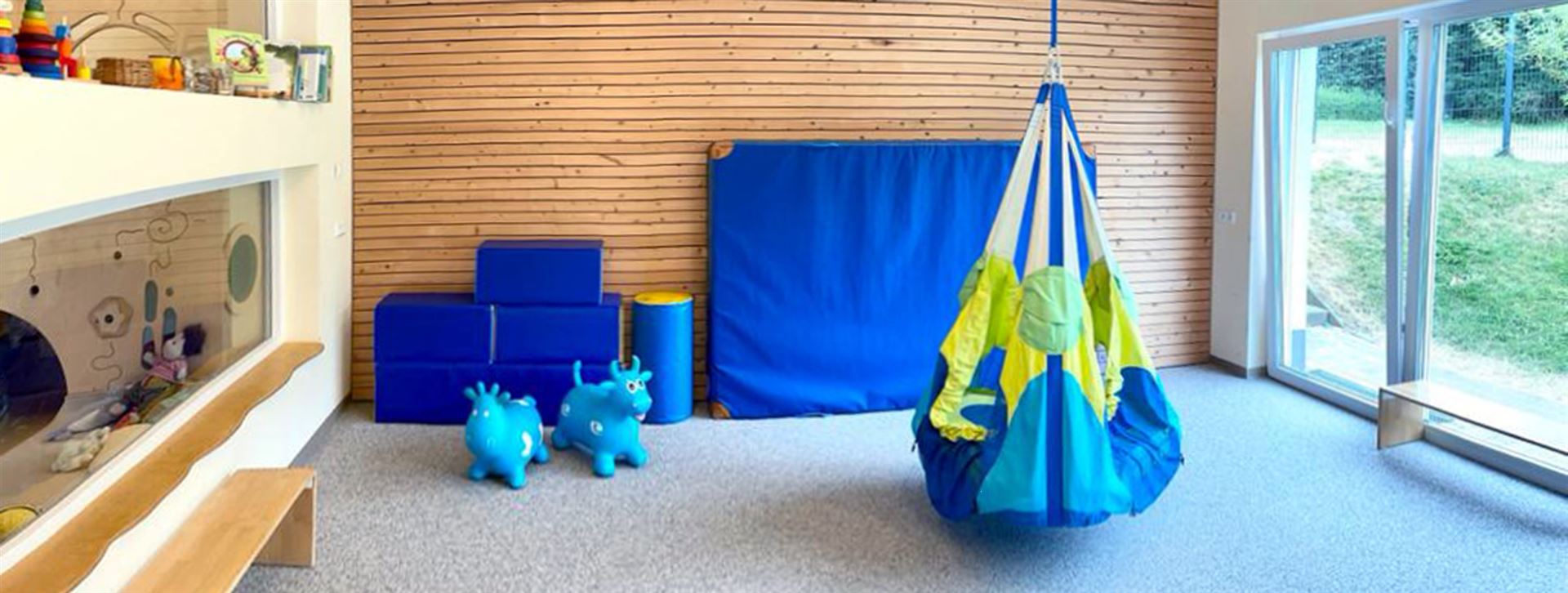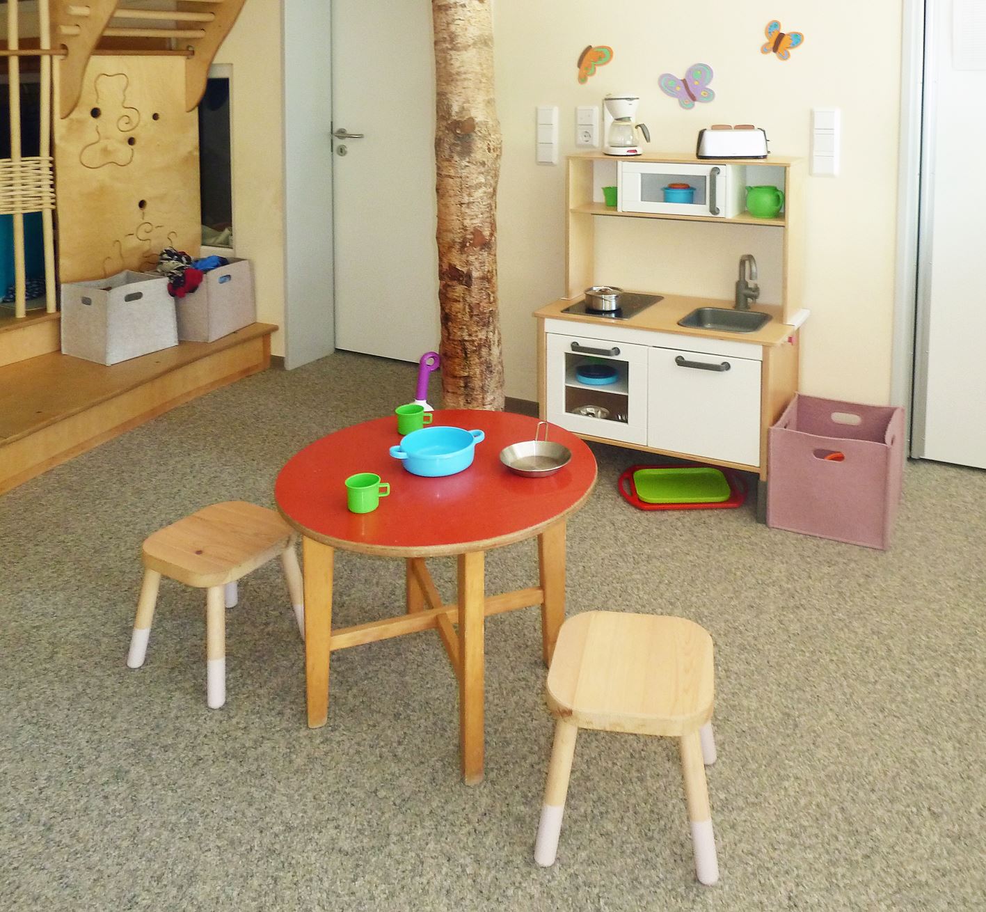 Eine Spiellandschaft kommt den Bedürfnissen der Kinder nach Klettern, Treppen steigen, Rutschen, aber auch Verstecken, Entdecken und Ausruhen nach. Ein reichhaltiges, regelmäßig wechselndes Materialangebot gibt die Möglichkeit, soziales Miteinander zu lernen, Phantasie anzuregen und Sprache weiter zu fördern.