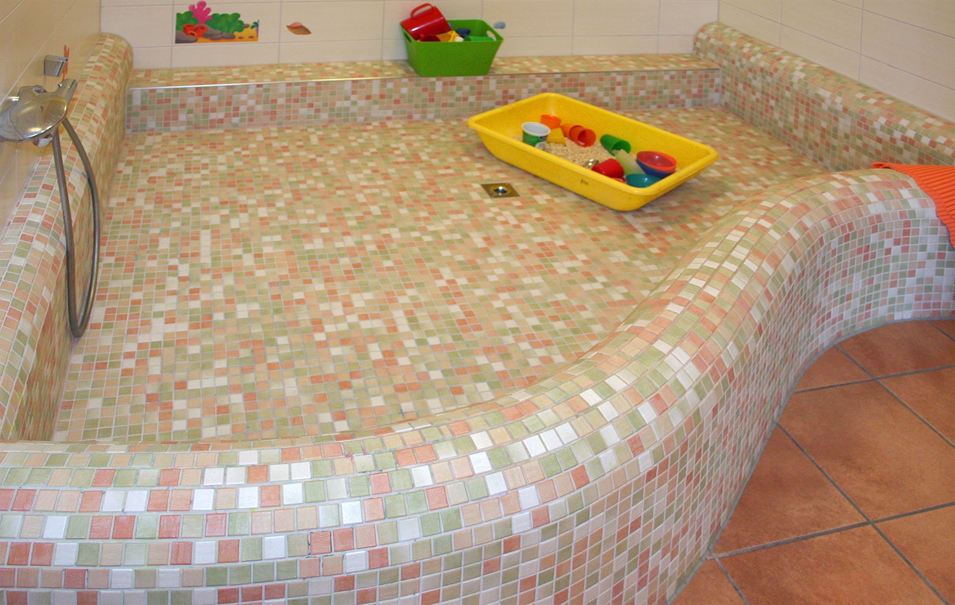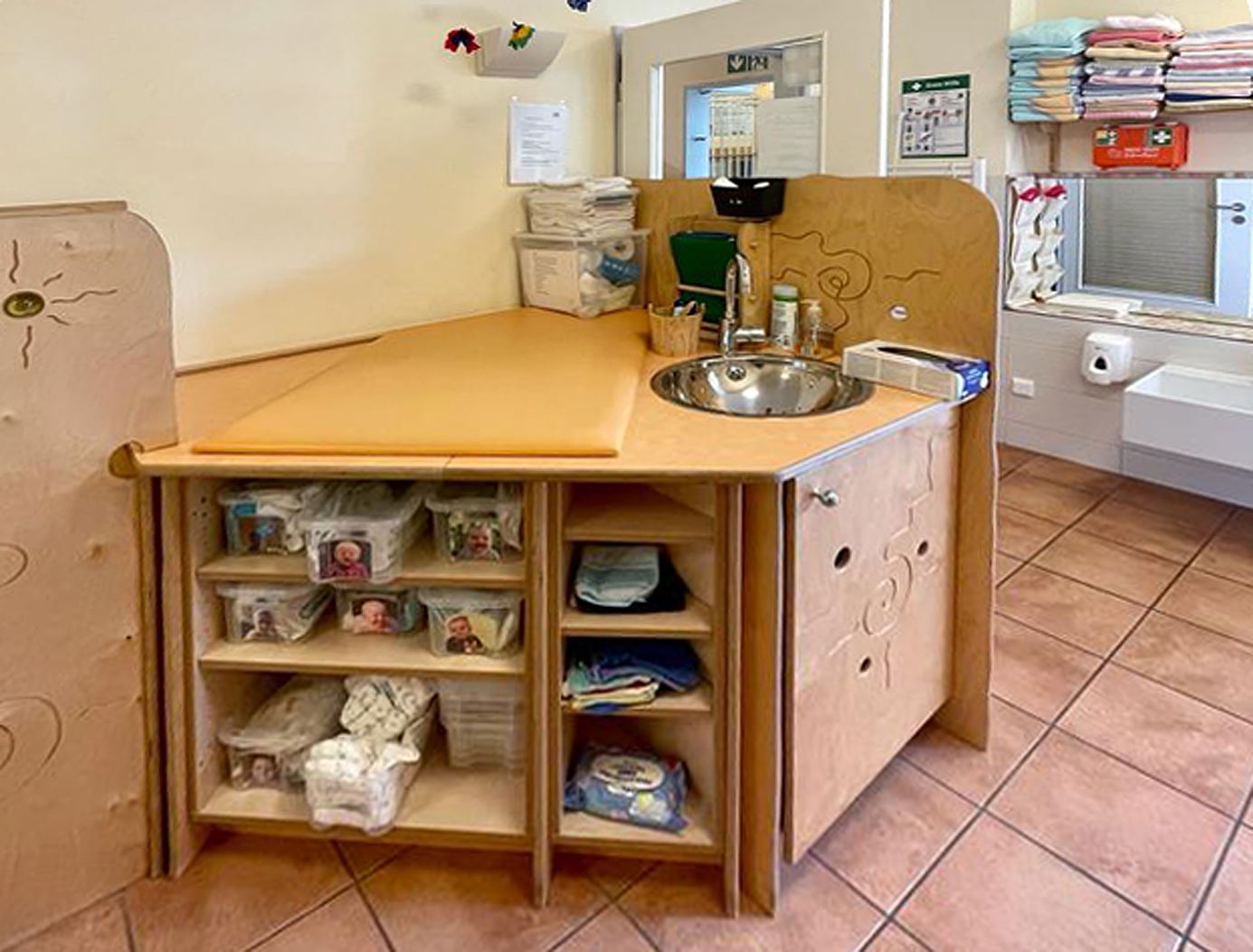 Die Waschrinne mit drei unterschiedlichen Wasserhähnen nutzen die Kinder täglich zur Körperpflege. Sie bietet ihnen aber auch die Möglichkeit, alleine oder zu mehreren mit Wasser zu hantieren und zu experimentieren. Im großen Planschbereich experimentieren die Kinder mit Rasierschaum oder Farben und erleben ihren Körper mit allen Sinnen. Es gibt einen Wickeltisch mit eingebauter Treppe und integriertem Waschbecken, sowie zwei kleine Kindertoiletten.