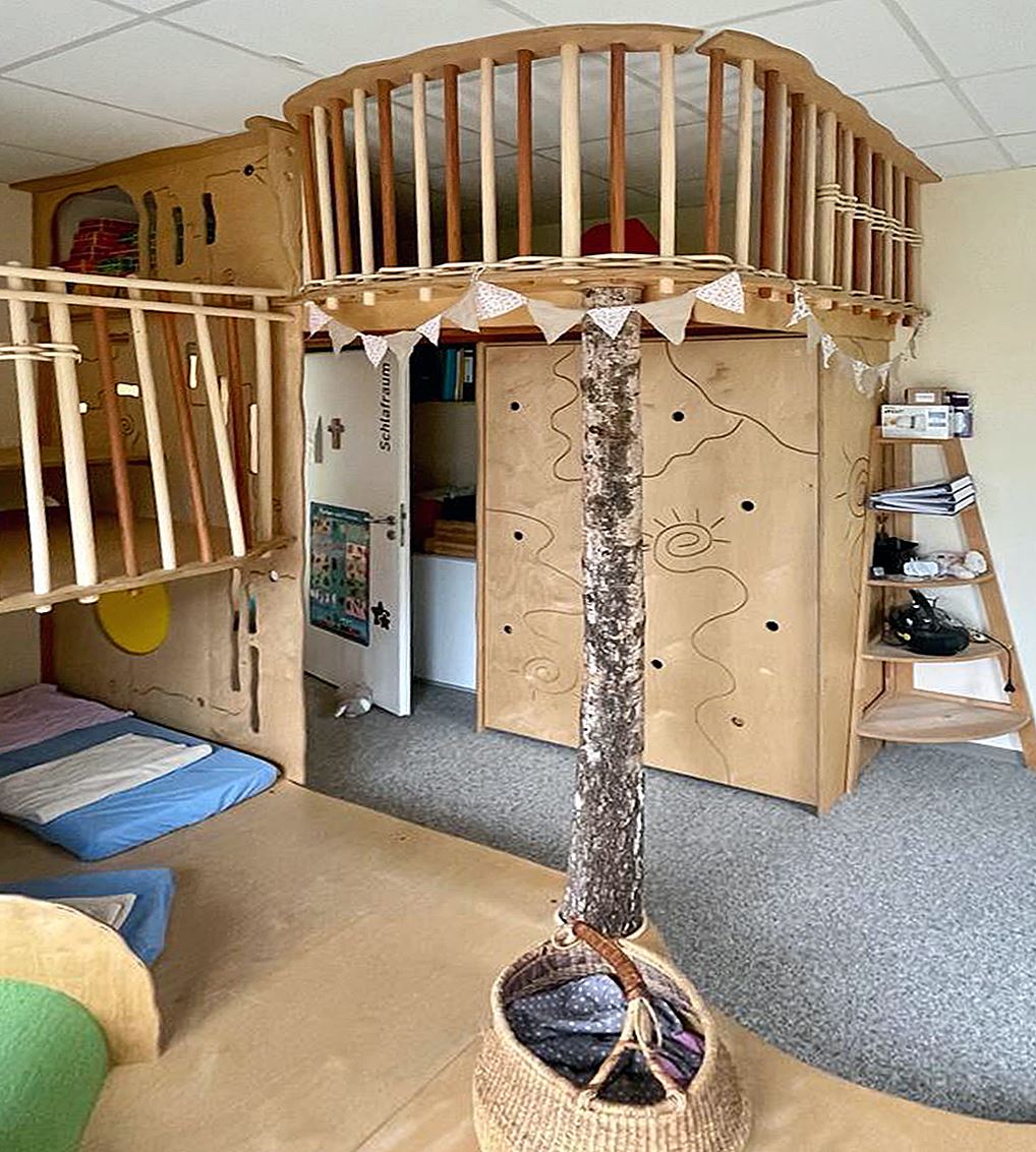 Der Schlafraum bietet viel Platz für Matratzen. Es gibt auf verschiedenen Ebenen Ecken, Nischen, Höhlen, in denen Kinder sich zurückziehen können. Dies vermittelt ihnen Sicherheit und Geborgenheit.