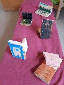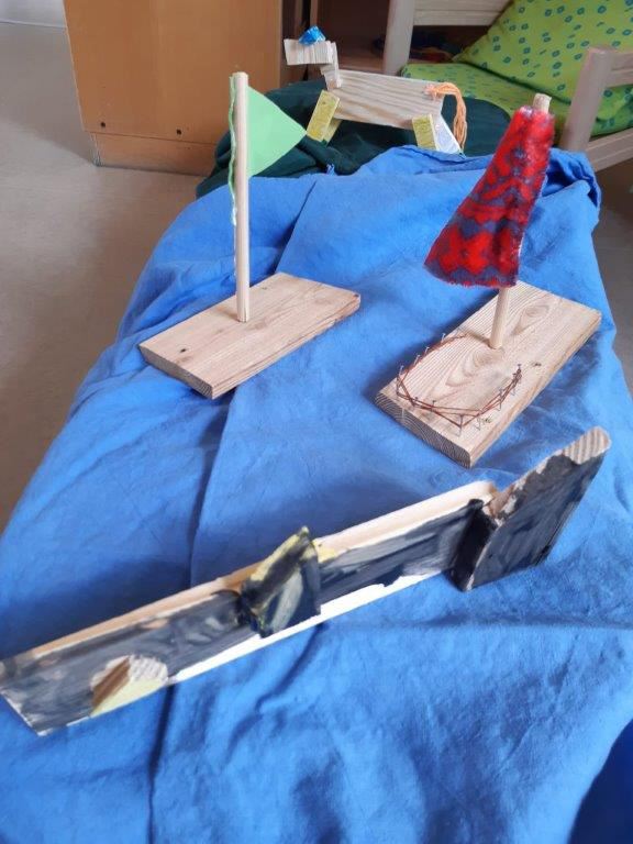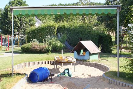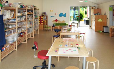 Im Werkraum stehen den Kindern 2 Werkbänke und einige Werkzeuge zur Verfügung. So kann dort z.B. mit Holz gesägt, gehämmert oder experimentiert werden. Ein großer Holzwebrahmen lädt zum gemeinsamen Gestalten ein. Auch gibt es in diesen Raum einen Sandtisch.