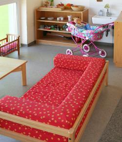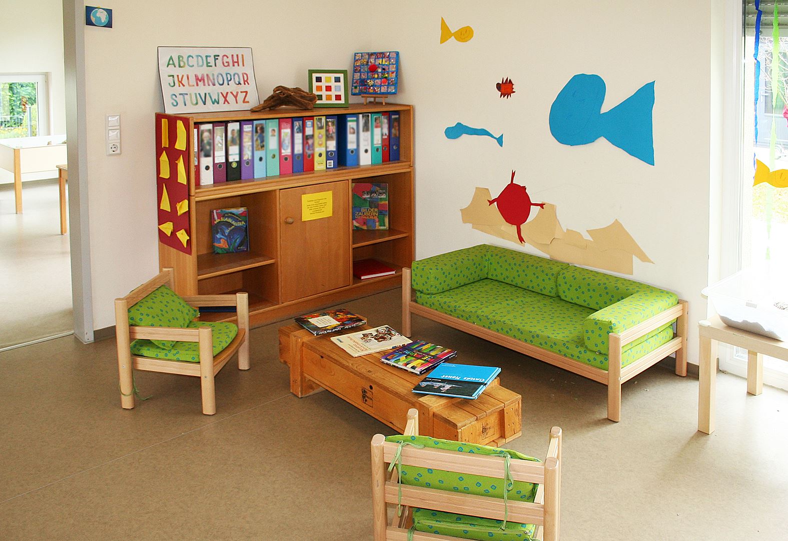 Für die Kinder, die ruhig starten oder sich während des Tages zurückziehen möchten, ist der Ruheraum eingerichtet. Hier können Sie alleine, oder gemeinsam mit anderen, Bücher anschauen, mit Decken und Kissen Höhlen bauen, ihre Portfolio-Ordner ansehen, ... Zudem ist es ein Raum für Angebote der Kleingruppen (Erzählrunden, Geschichten hören, Geburtstagsfeiern).