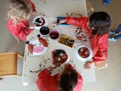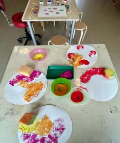 Ob eigene Ideen mit Alltagsmaterialien oder unserer Materialvielfalt in den offenen Regalen, hier werden jeden Tag Kunstwerke erstellt. Hier laden große Malwände und eine Staffelei dazu ein, mit Finger- oder Wasserfarben großflächig zu malen. Für Impulse gibt es einen gesonderten Tisch um den Freiraum für selbständiges Gestalten nicht zu schmälern. Auch in diesem Raum darf eine Couch nicht fehlen, um einfach zu schauen, sich inspirieren zu lassen oder den eigenen Potrtfolio-Ordner anzusehen.