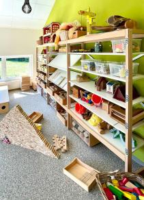 Viel Platz zum Bauen bietet unser Bauzimmer. In den offenen und übersichtlich sortierten Regalen finden die Kinder ganz unterschiedliche Materialien, wie Bausteine, Holzfiguren, Lego und gesammelte Fundstücke aus der Natur wie Steine, Holzscheiben, Äste und Alltagsmaterialien in großer Anzahl. Bilder von Gebäuden und Bücher rund um Baustellen geben ihnen Anreize, etwas nachzubauen.