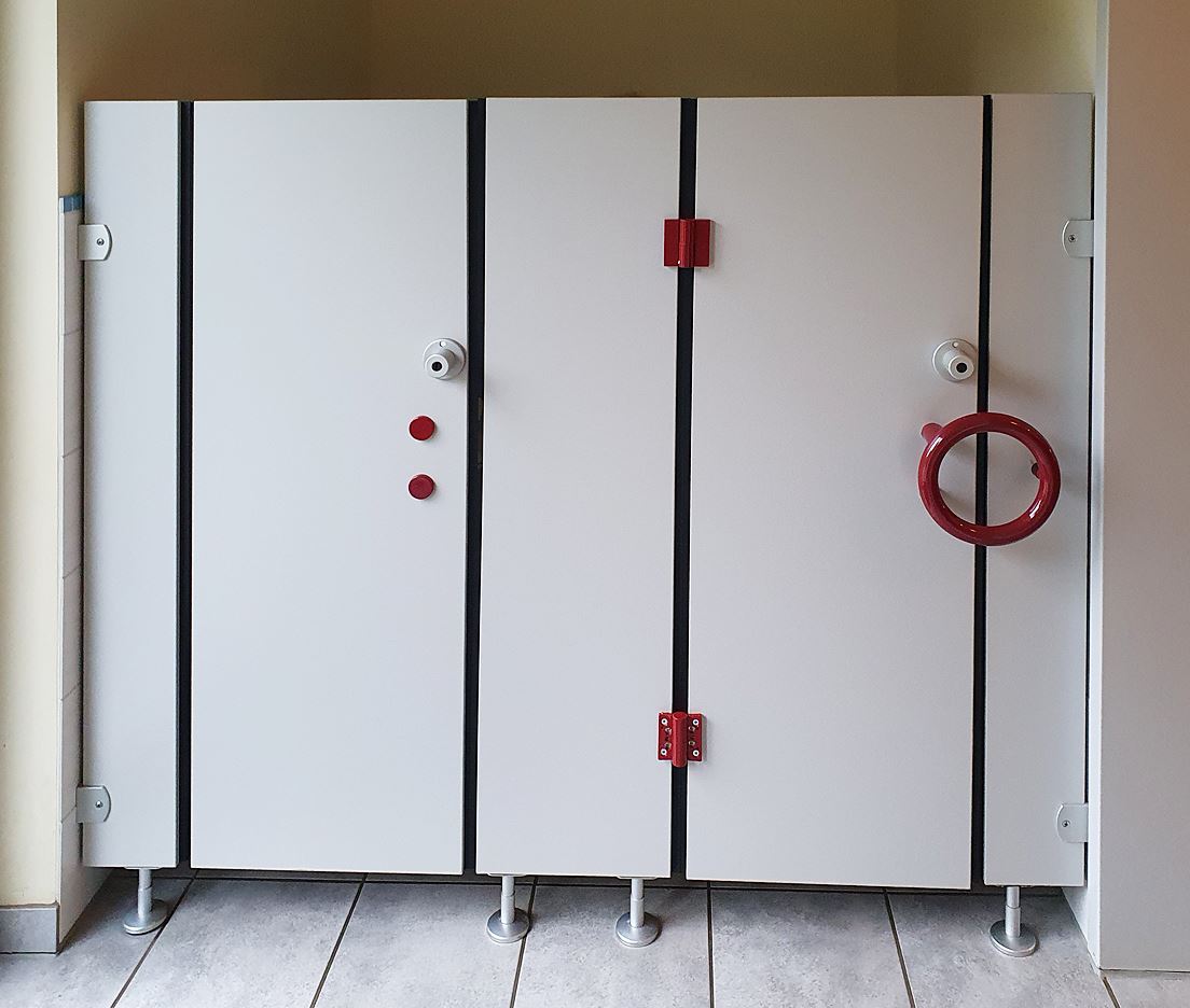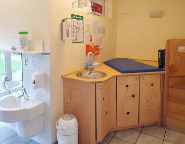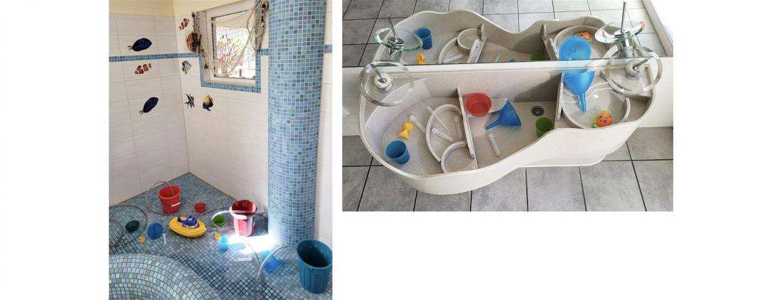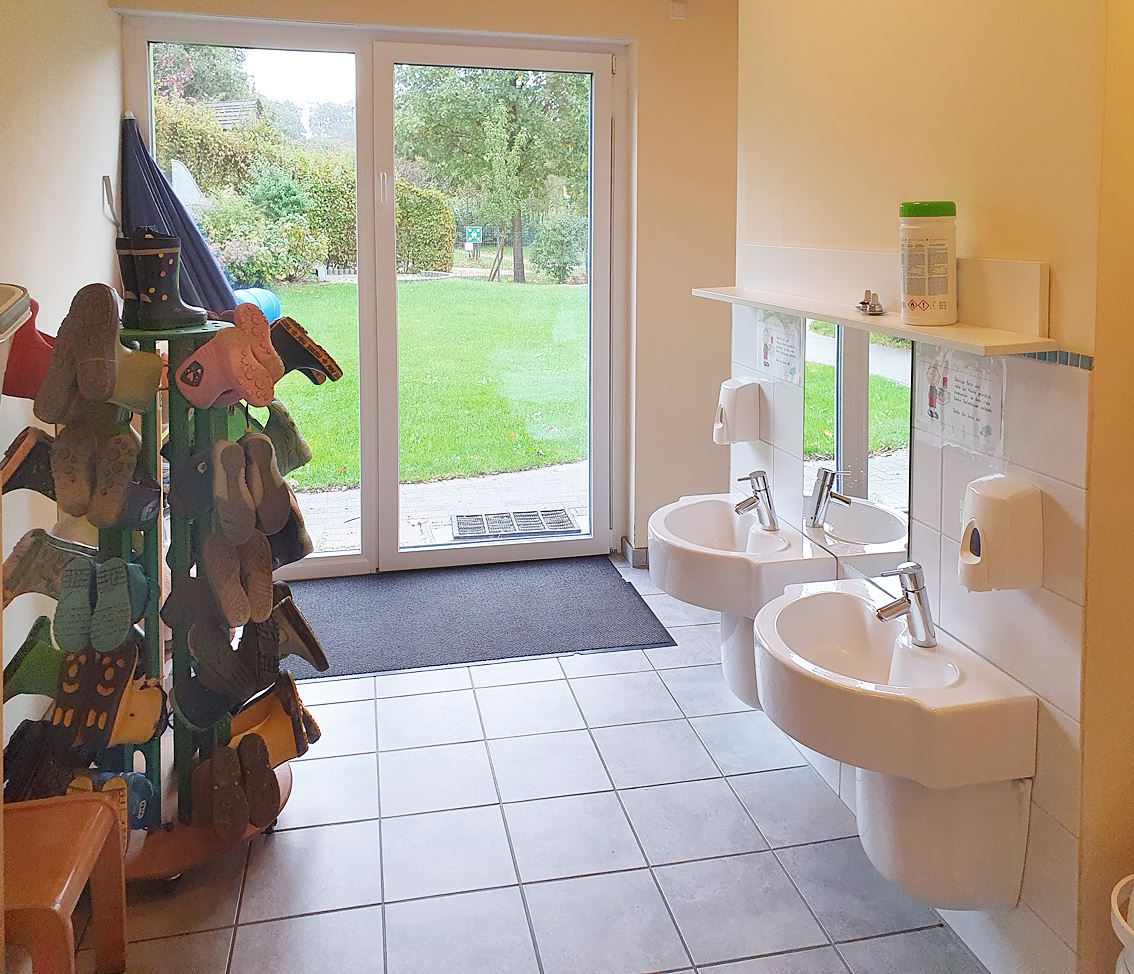 In einem der Waschräume gibt es eine Waschrinne mit drei Wasseranschlüssen, die in unterschiedliche Wasserhähne münden und so realitätsnahe Erfahrungen ermöglichen. Im zweiten Waschraum befindet sich ein Wickeltisch mit Treppe und einem eingebauten Waschbecken. Alle Toiletten sind mit Hilfeknöpfen ausgestattet, so dass Kinder, die Unterstützung benötigen, eine Erzieherin darüber herbeirufen können.