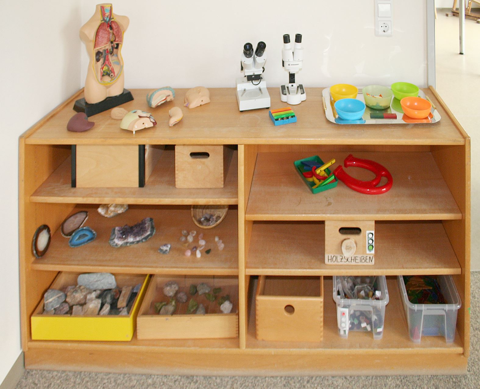 Hier finden sich die verschiedensten Materialien zum Forschen, wie zum Beispiel Magnete, Sanduhren, Modelle vom Körper, Mikroskope, Lichtboarde, Lichtprojektoren und noch vieles mehr. Hier kann jedes Kind etwas finden, das seine Neugier und Entdeckerlust fördert. Manches steht immer zur Verfügung, anderes wird je nach Themen und Interessen der Kinder bereitgestellt und von einer Mitarbeiterin begleitet.