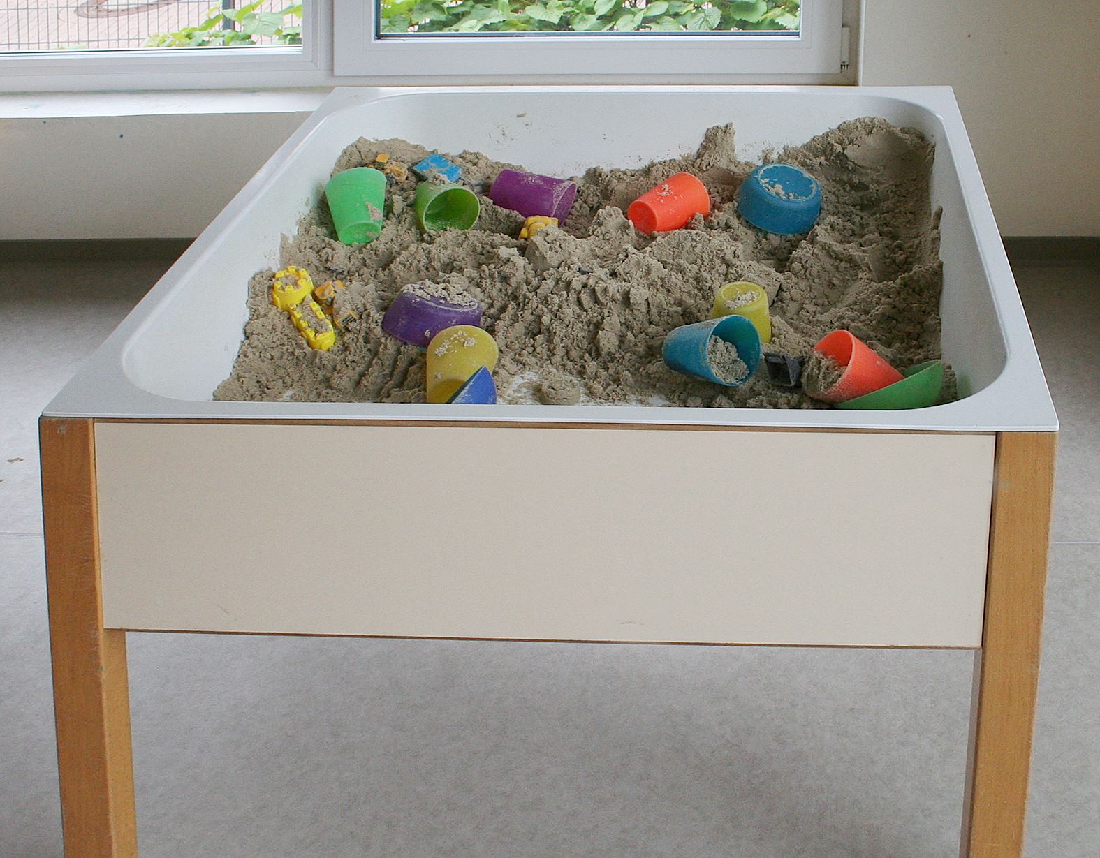 Hier gibt es ein Kunststoffwaschbecken mit der Möglichkeit Staudämme zu bauen, mit Wasser zu experimentieren. Auf einem Tisch stehen verschiedene Materialien bereit: Becher, Trichter, Messbehälter, Kolbenspritzen, Schläuche, Korken, Holzstücke, kleine Steine, Muscheln, Metalllöffel usw.