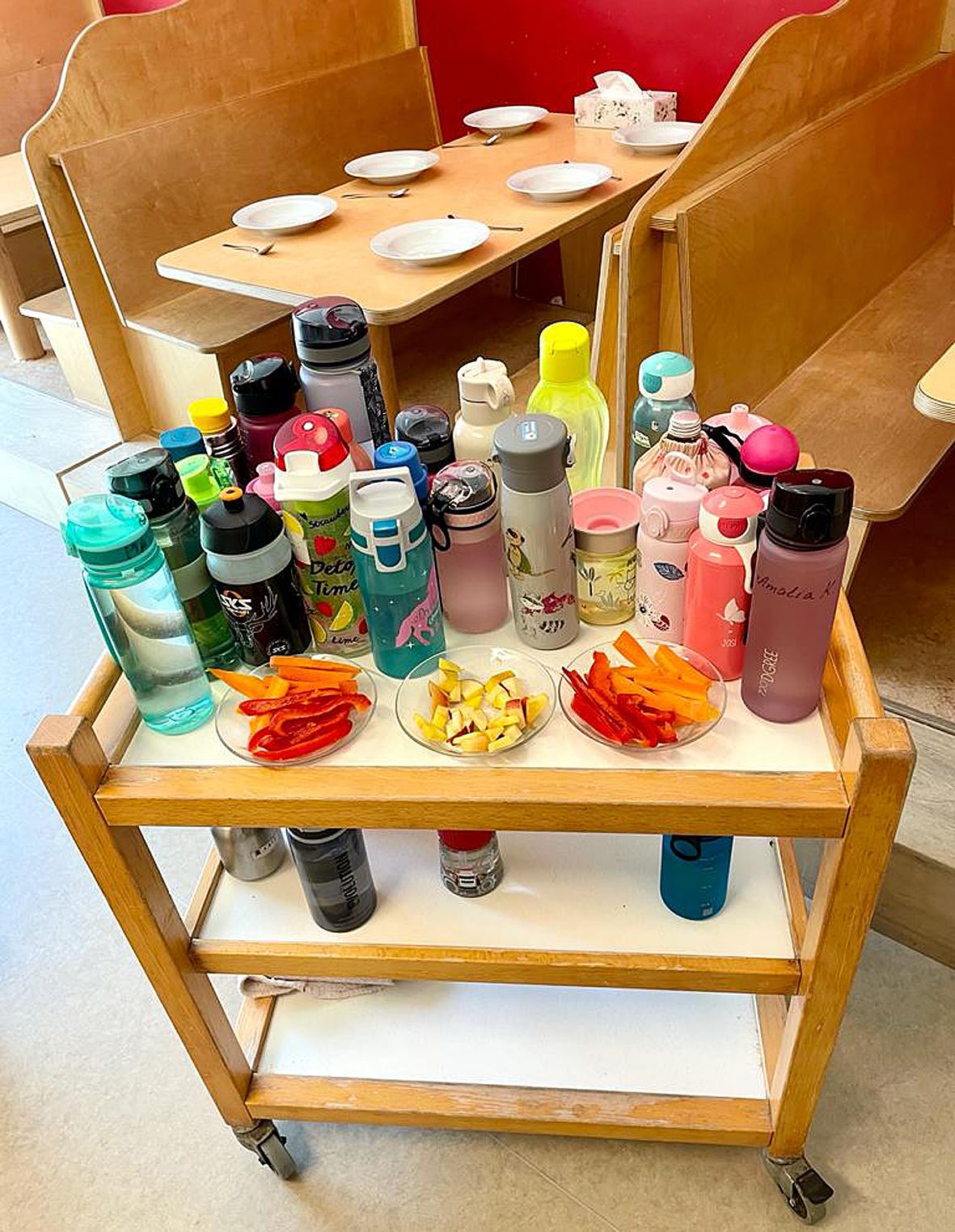 Das Kinderrestaurant wird für Frühstück, Mittagessen und Picknick genutzt. Die Sitzecken bieten eine schöne Möglichkeit, bei den Mahlzeiten miteinander ins Gespräch zu kommen. Hier finden auch hauswirtschaftliche Angebote in Kleingruppen, wie zum Beispiel Backen und Kochen, statt. Auf den Boards können Kinder sich über das Essensangebot des Tages informieren und sehen, wer welche Tischdienste übernommen hat.