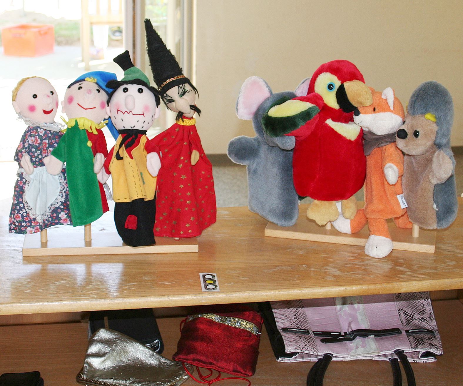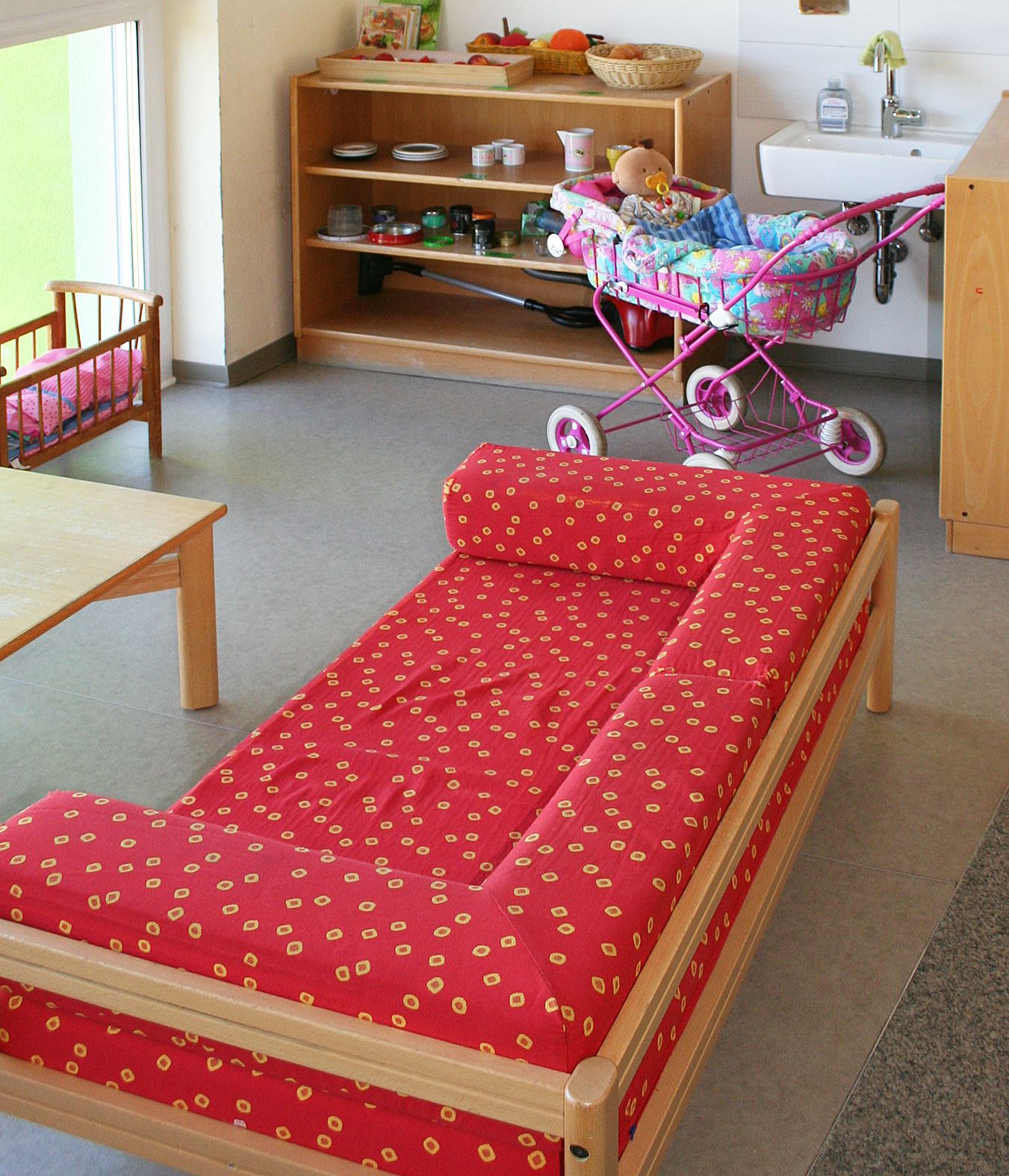 Im Rollenspiel können die Kinder in andere Rollen schlüpfen, ob verkleidet, auf der Bühne oder in der Kinderwohnung. Die Bühne dient ihnen dazu, ihre eigene Show zu präsentieren: mit Musikinstrumenten, Handpuppen oder dem eigenen Körper. In der Kinderwohnung werden familiäre Situationen nachgespielt, verarbeitet und weiterentwickelt. Auch die Tischspiele haben hier ihren Platz. Wichtig sind die Tiere, die von den Kindern beobachtet und versorgt werden. Das Angebot in diesem Bereich ist nicht immer gleich, es wird mit den Kindern nach ihren Bedürfnissen und Interessen umgestaltet.