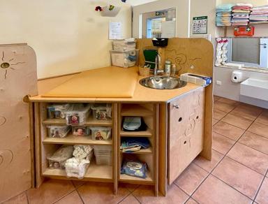 Die Waschrinne mit drei unterschiedlichen Wasserhähnen nutzen die Kinder täglich zur Körperpflege. Sie bietet ihnen aber auch die Möglichkeit, alleine oder zu mehreren mit Wasser zu hantieren und zu experimentieren. Im großen Planschbereich experimentieren die Kinder mit Rasierschaum oder Farben und erleben ihren Körper mit allen Sinnen. Es gibt einen Wickeltisch mit eingebauter Treppe und integriertem Waschbecken, sowie zwei kleine Kindertoiletten.