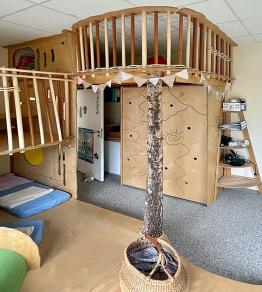 Eine Spiellandschaft kommt den Bedürfnissen der Kinder nach Klettern, Treppen steigen, Rutschen, aber auch Verstecken, Entdecken und Ausruhen nach. Ein reichhaltiges, regelmäßig wechselndes Materialangebot gibt die Möglichkeit, soziales Miteinander zu lernen, Phantasie anzuregen und Sprache weiter zu fördern.