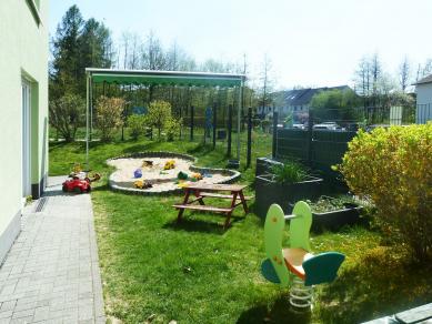 Ein großer Sandkasten, ein Wipptier, ein Hochbeet und die Möglichkeit mit Bobbycars zu fahren lassen keine Langeweile aufkommen.