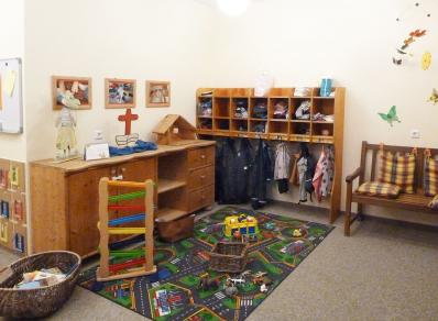 Der Flurbereich, den die Kinder jederzeit nutzen können, bietet ihnen Bewegungs- und Entfaltungsmöglichkeiten z.B. für Rollenspiele oder als Rückzugsort. Außerdem gibt es Magnetwände mit aktuellen Informationen für die Eltern und viel Platz für die Kleidung und Utensilien der Kinder.