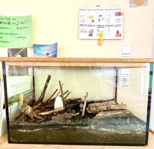 Hier gibt es ein Kunststoffwaschbecken mit der Möglichkeit Staudämme zu bauen, mit Wasser zu experimentieren. Auf einem Tisch stehen verschiedene Materialien bereit: Becher, Trichter, Messbehälter, Kolbenspritzen, Schläuche, Korken, Holzstücke, kleine Steine, Muscheln, Metalllöffel usw.