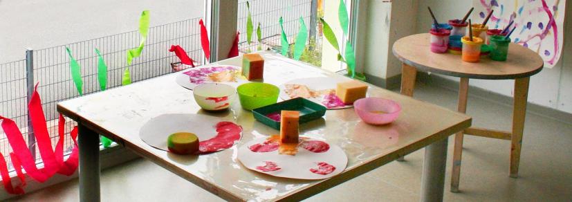 Ob eigene Ideen mit Alltagsmaterialien oder unserer Materialvielfalt in den offenen Regalen, hier werden jeden Tag Kunstwerke erstellt. Hier laden große Malwände und eine Staffelei dazu ein, mit Finger- oder Wasserfarben großflächig zu malen. Für Impulse gibt es einen gesonderten Tisch um den Freiraum für selbständiges Gestalten nicht zu schmälern. Auch in diesem Raum darf eine Couch nicht fehlen, um einfach zu schauen, sich inspirieren zu lassen oder den eigenen Potrtfolio-Ordner anzusehen.
