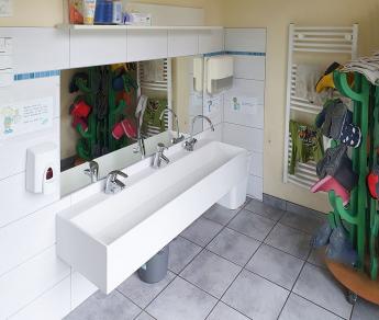 In einem der Waschräume gibt es eine Waschrinne mit drei Wasseranschlüssen, die in unterschiedliche Wasserhähne münden und so realitätsnahe Erfahrungen ermöglichen. Im zweiten Waschraum befindet sich ein Wickeltisch mit Treppe und einem eingebauten Waschbecken. Alle Toiletten sind mit Hilfeknöpfen ausgestattet, so dass Kinder, die Unterstützung benötigen, eine Erzieherin darüber herbeirufen können.