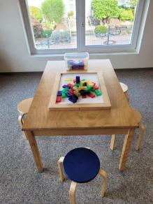 Im Werkraum stehen den Kindern 2 Werkbänke und einige Werkzeuge zur Verfügung. So kann dort z.B. mit Holz gesägt, gehämmert oder experimentiert werden. Ein großer Holzwebrahmen lädt zum gemeinsamen Gestalten ein. Auch gibt es in diesen Raum einen Sandtisch.